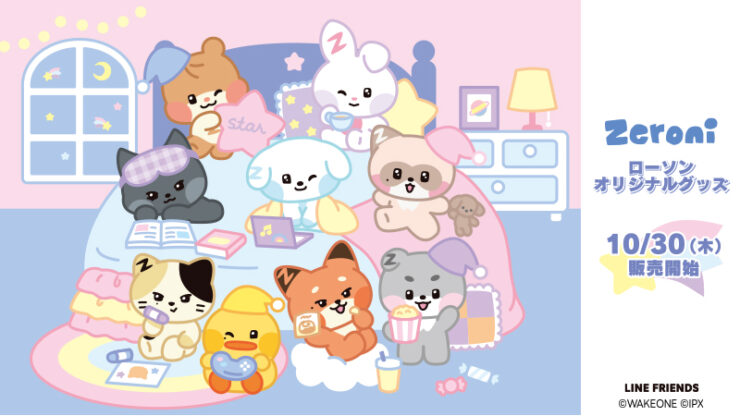 「zeroni」×ローソンコラボ グッズが2025年10月30日店頭発売、夜のリラックスタイムを楽しむzeroni達の可愛い『マスコット付きリボンピン』『アクリルカラビナキーホルダー』『缶ミラー』が登場