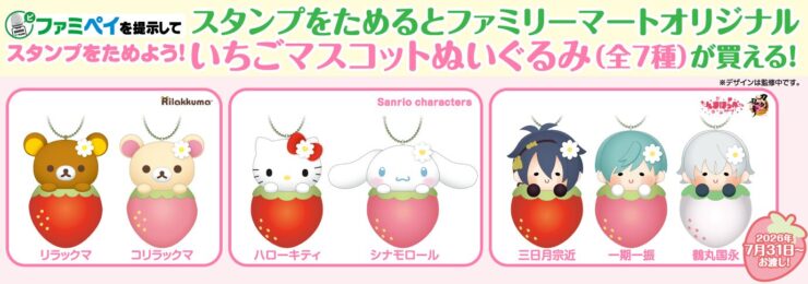 刀剣乱舞 / サンリオ / リラックマの可愛い「いちごマスコットぬいぐるみ」がファミマで登場、ファミマのファミペイ スタンプ企画が2025年12月16日スタート。スタンプを集めるとマスコットぬいを購入可能