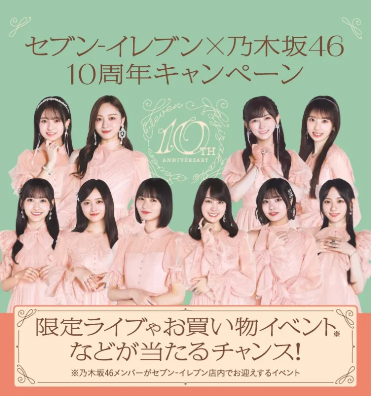 『乃木坂46』×セブンイレブンコラボ 2025、乃木坂46×セブン コラボ10周年キャンペーンが2025年10月28日スタート。限定ライブ招待券やお買い物イベント参加券が当たる! 瀬戸口心月さんなど10名がキャンペーンに参加