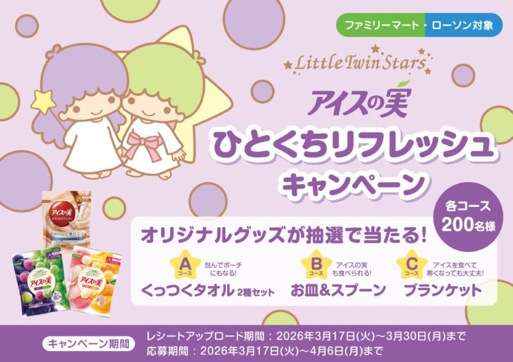 ファミマ / ローソンで「リトルツインスターズ×アイスの実」コラボグッズが当たる! 江崎グリコ“アイスの実 ひとくちリフレッシュキャンペーン”が2026年3月17日スタート。グッズは『くっつくタオル』『お皿&スプーン』『ブランケット』の3種類。応募時にスマホ壁紙プレゼント