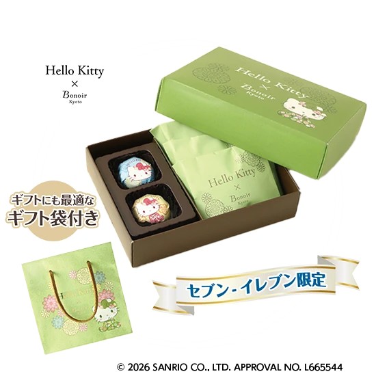 セブンイレブン限定「ハローキティ×ボノワール京都 抹茶ガトーショコラ」が2026年2月19日頃発売、ホワイトデー向け商品。舞妓姿のキティちゃんがパッケージ&ギフト袋に登場